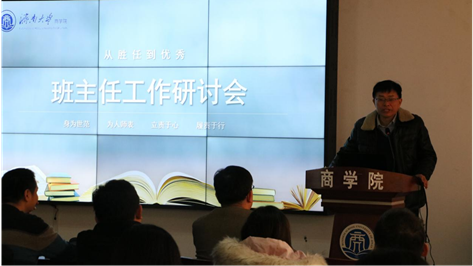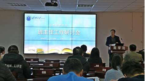 在经管楼615会议室召开班主任工作研讨会,学院领导班子成员、各系主任、全体班主任和辅导员参加会议。会议由学院党委副书记、副院长袁海占主持。