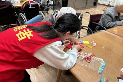 志愿者们带着精心准备的手工材料来到疗养院。在工作人员的带领下,志愿者们来到活动室,与爷爷奶奶们亲切交谈,询问他们的生活近况和身体状况。活动开始后,志愿者们耐心地向爷爷奶奶们讲解福袋制作的步骤和技巧,并手把手地指导他们进行裁剪、缝制和装饰。爷爷奶奶们兴致勃勃地参与其中,与志愿者们共同完成了一个个精美的福袋。