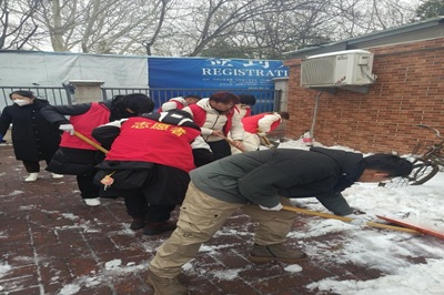 青年志愿者协会的"红马甲"们已踏着积雪走进舜园社区,在社区为居民开辟出安全通道,展现出百万大学生积极投身社会实践的担当风采。