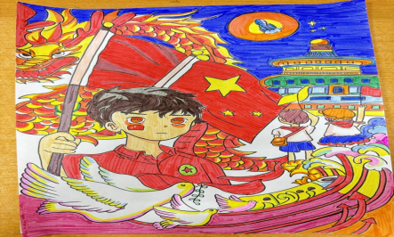 优秀手绘作品《家国情长,青春载梦》中,少年手擎红旗立于巨龙之侧,天坛与航天火箭在星空下交相辉映,红领巾、和平鸽的元素,让青春力量与家国情怀同频共振。