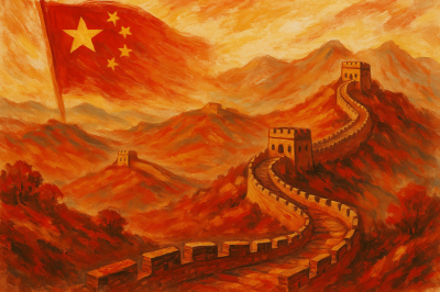 《长城颂》则以暖色调铺陈出长城的雄浑与国旗的炽热,山河壮阔间,家国的厚重与庄严尽显。作品将五星国旗与长城结合,传递出浓厚的家国情怀,色彩浓烈、笔触饱满,既有艺术感染力,也带有鲜明的象征意义。