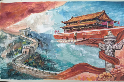 手绘作品《筑牢红色根基,铸就家国精魂》将天安门与长城置于水彩晕染的画境中,红绸缠绕的华表与盛放的繁花,让历史底蕴与新时代的朝气交织,呈现出国家兴盛的蓬勃景象。