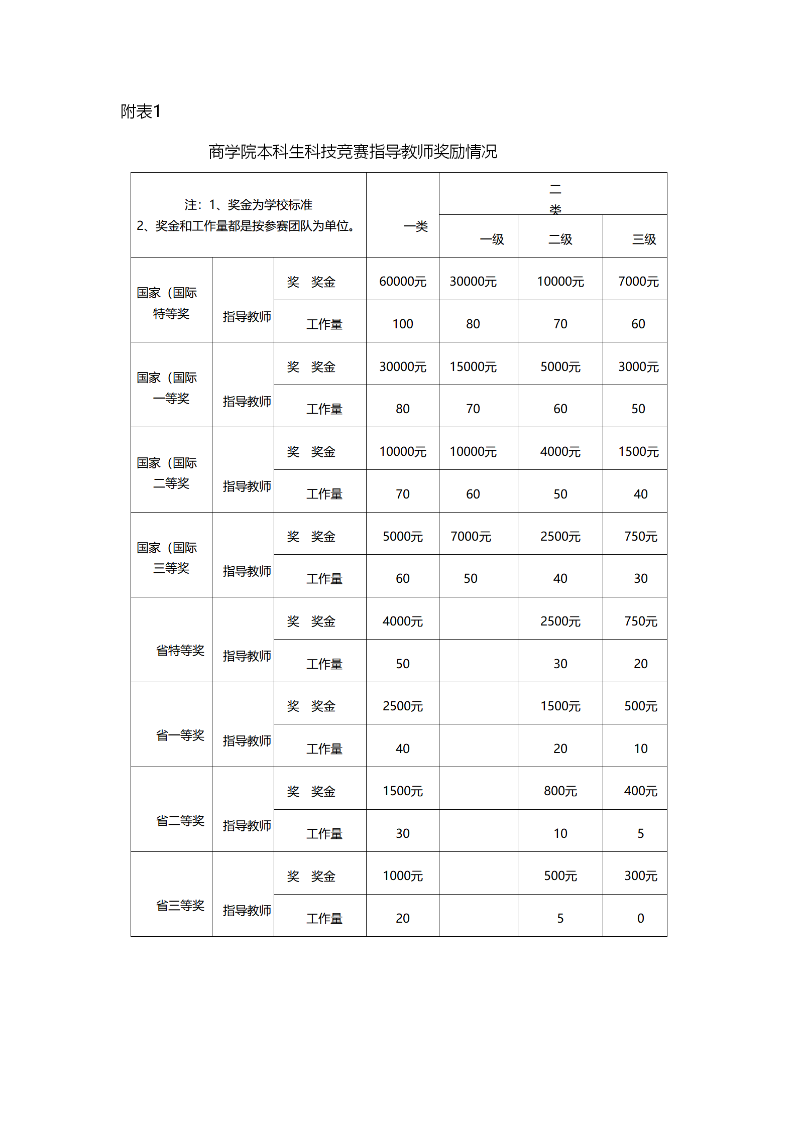 分两类对指导教师进行奖励,一类指“挑战杯”“创青春”“互联网+”学生系列科技学术竞赛,学院按学校奖励额度的50%进行匹配;二类指学科单项竞赛,其中二类分三级竞赛进行表彰,学院按学校奖励额度的50%进行匹配;未纳入学校科创奖励体系的赛事,学院按学校二类三级赛事奖励额度的20%进行匹配。学校具体奖励额度见附表1。
