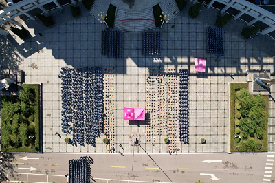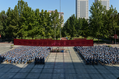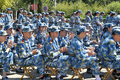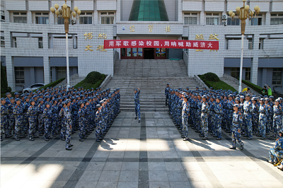 自律会在经管楼广场举办“百年峥嵘心向党,军歌嘹亮筑华章”军训拉歌大赛。