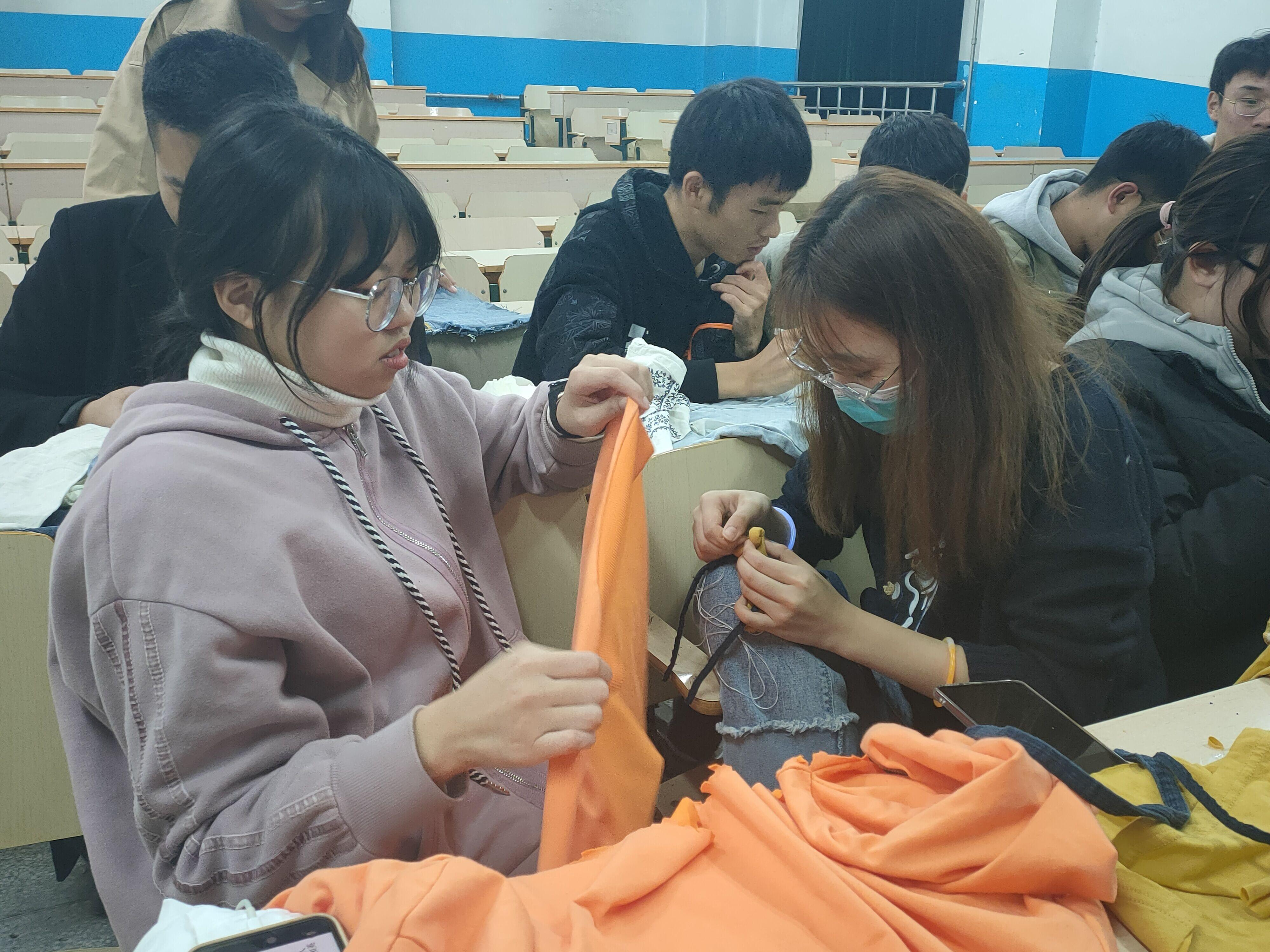 青年志愿者协会的志愿者们在将衣物进行分拣、收纳、标识后,捐赠给了舜玉基地、大观园基地和同心互惠组织,并预留出一部分衣物,通过旧衣改造的形式,为同学们提供了一个可以肆意发挥创意的空间,同学们根据自己的想法设计草图,将旧衣物按照设计图纸进行裁剪、缝制,将衣物原有的结构并通过新的形式展现出来。活动期间,出现了不少别出心裁的设计作品,有的同学将长衬衫剪短后搭配撞色的领带,令原本呆板的衬衫变得设计感十足;有的同学将衣服剪成小块的布料再折叠成形状漂亮的蝴蝶结使其可以被进一步加工成发卡或者胸针;有的同学将款式比较老旧的短袖做成休闲时尚的布袋,无论是日常通勤还是上课上班都可以用它搭配。最后,大家将改造好的衣物进行打包,由免费a片