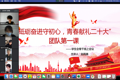 学生会召开了“砥砺奋进守初心,青春献礼二十大”团队第一课,本次会议以线上会议的形式召开,由学生会执行主席赵雨晨主持,学生会全体骨干工作人员参会。