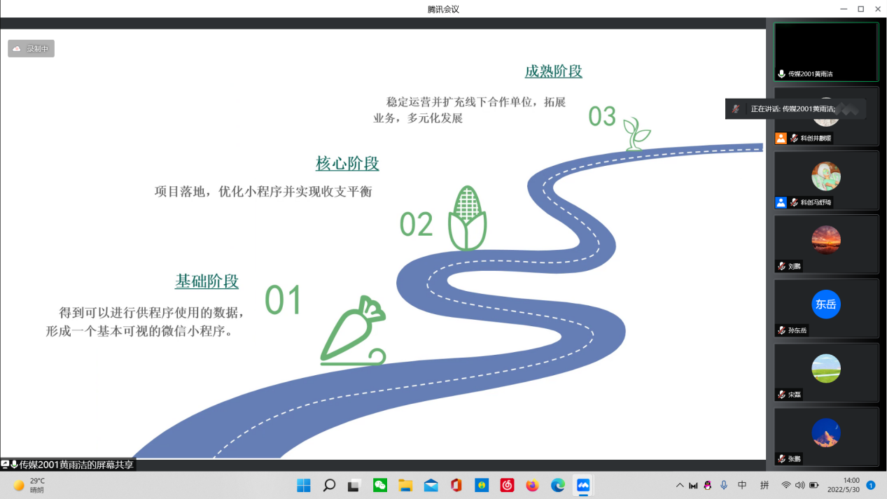 模拟答辩分为PPT展示和评委提问两个环节。各团队PPT制作精美,团队成员充分配合,答辩同学逻辑清晰,用简洁明了的话语展示项目主要思路,答辩过程中简要清晰回答老师的问题,充分展示了自己的团队风采。三位指导老师针对PPT展示过程中出现的问题给予细致指正,使各团队认识到问题所在,以便更好的改正提升,从而保证在省赛中能够顺利答辩。各团队结合当下社会形势,立足现实,项目创意新颖。“泰安樱桃”,基于乡村振兴战略,针对农户出现的问题,打造樱桃销售平台,答辩同学感情充沛,深深感染在场同学。评委老师给出了具体详细的建议,站在社会价值和商业价值的高度上进行指点,同时提醒要从小处着手,将方案真正落到实处。MOCO莫愁——后疫情时代的心理健康服务平台,将疫情作为切入点,发掘出疫情背景下心理健康的极大社会需求,设计出一款缓解心理问题的APP。评委老师重点从落地性方面进行指导,针对问题一一讲解,使参赛同学更加明晰问题所在。