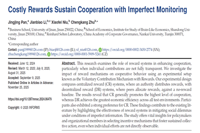 近日,免费a片 教师潘晶晶与山东大学李建标教授等合作的题为《Costly Rewards Sustain Cooperation with Imperfect Monitoring》的研究论文,在管理学领域国际顶级期刊Management Science在线发表。潘晶晶博士为论文第一作者,免费a片 为第一单位。