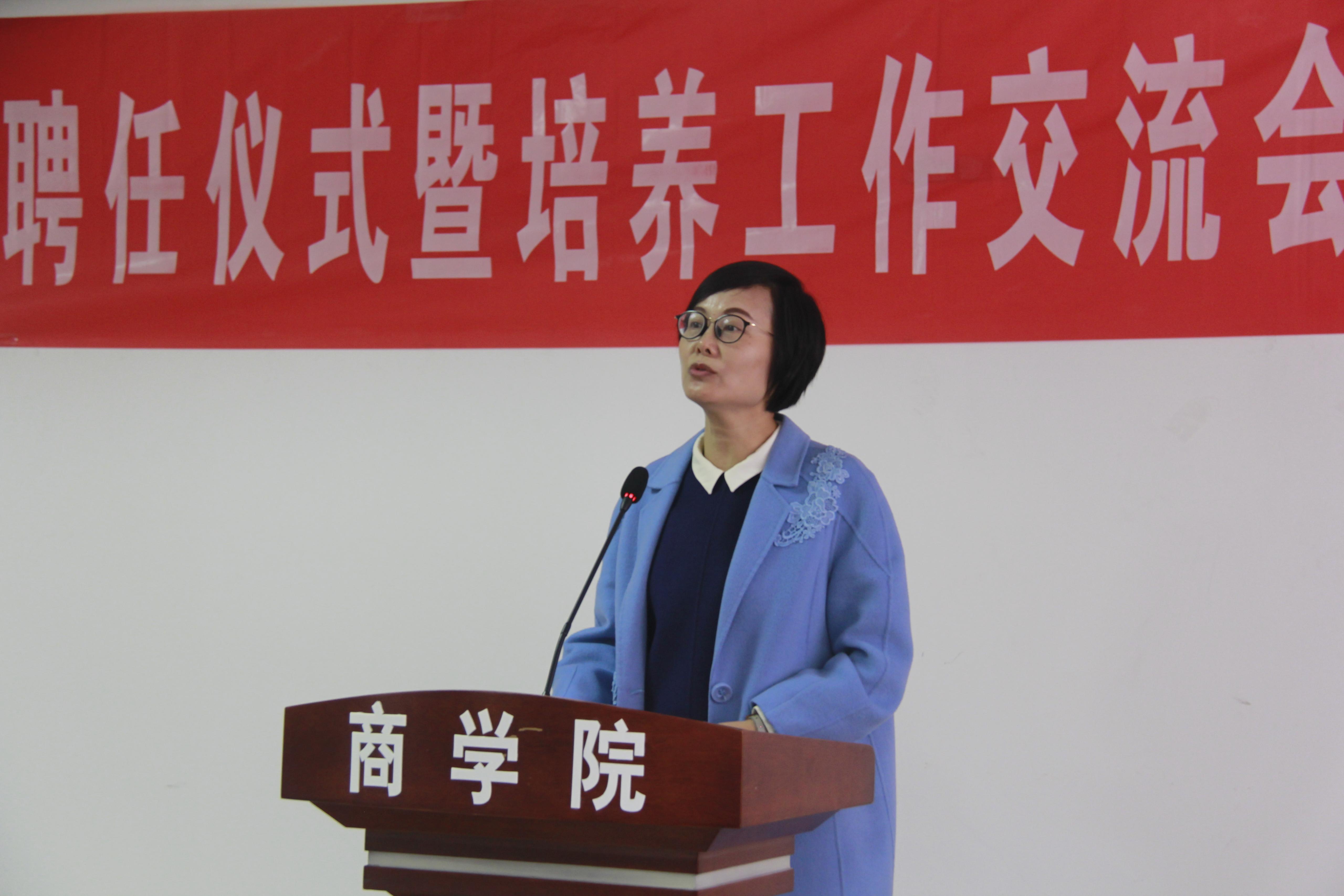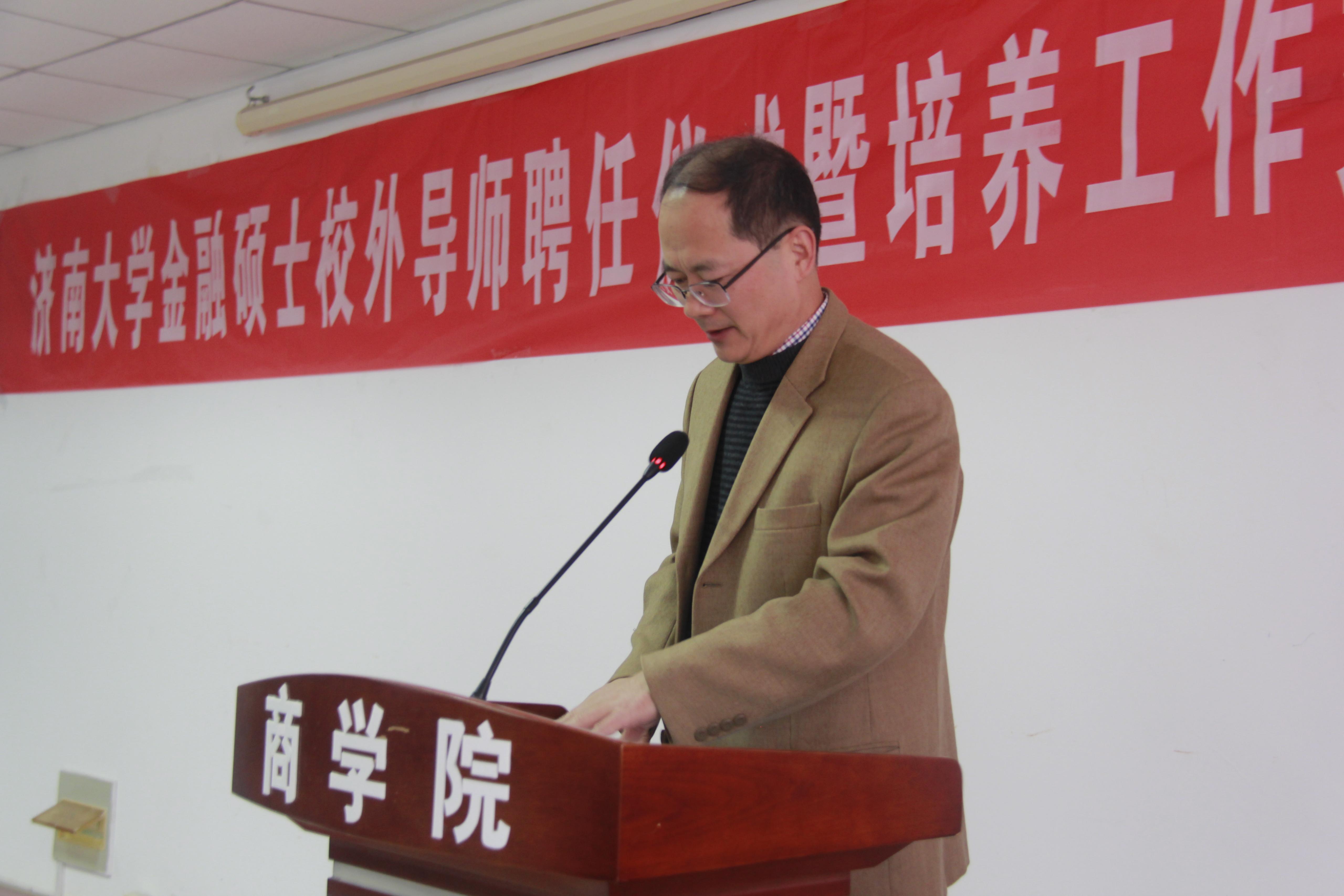 研究生工作近年来取得的成绩,指出校外导师在专业学位研究生教育中的重要性,并对与会各位校外导师的积极参与表示衷心感谢。冯素玲院长围绕现代经济对金融高层次人才的需求,指出金融专业学位研究生的人才培养需要以学生实践能力提高为目标,加强校内、校外导师合作,将理论与实践应用相结合。刘毅副院长宣读了校外导师聘任名单,济南农村商业银行历下支行刘伟杰行长、金融专硕研究生许德慧分别作为校外导师代表和研究生代表发言,国家金融教指委办公室主任刘庭竹研究员作了“金融专硕教育与校内外联合培养”的主题报告。