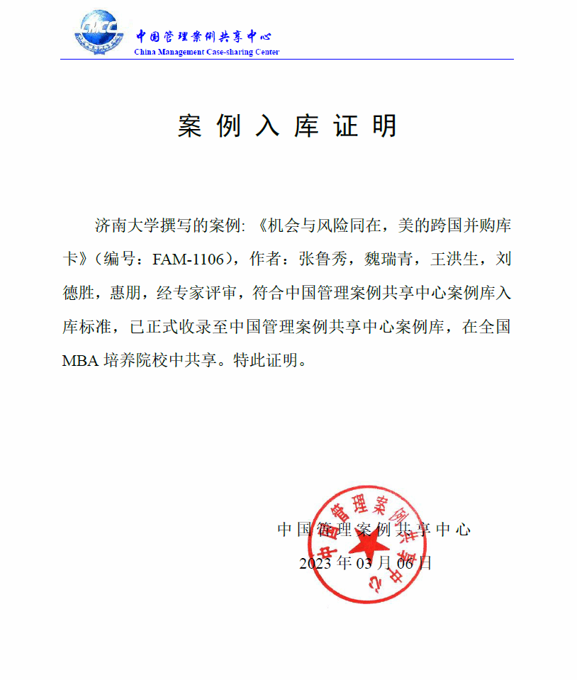 近日,我院张鲁秀教授团队撰写的案例《探索恒大集团深陷债务危机之谜》、《机会与风险同在,美的跨国并购库卡》已正式收录至中国管理案例共享中心。